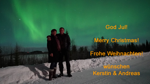 Pünktlich wie bestellt strahlte der Nachthimmel nach dem traditionellen Julbord am 4. Advent in allen Grüntönen, und auch für die kommende Festwoche stehen die Chancen auf den Himmelszauber gut! Dafür hat sich der Wettergott soeben einen bösen Ausrutscher erlaubt – gerade ist es mit +4 Grad wärmer als in Deutschland. Aber noch liegt genug Schnee und der nächste ist in Sicht!