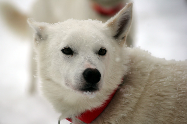 Aisbaer war unser erstgeborener eigener Welpe, weiß mit braunen Augen wie seine Mutter Doro. Und er musste als putziger Eisbär einen Namen mit „A“ bekommen – was lag da näher als Aisbaer? Der kräftige Rüde war von Anfang an ein kleiner Chaot: wild vor dem Start, aber absolut zuverlässig, nie krank und immer gut gelaunt. Er war ein unverzichtbarer Garant im Wettkampfteam. Aisbaer geht meistens in der 2. Reihe vorn, neben seiner Schwester Anouk sogar als Leithund. Er ist dort aber auch mal für eine Überraschung gut – vor allem, wenn frische Elchspuren locken… Inzwischen könnte er zwar schon in Rente gehen, aber keine Chance: Er fordert es sehr lautstark ein, mit auf Tour gehen zu dürfen!